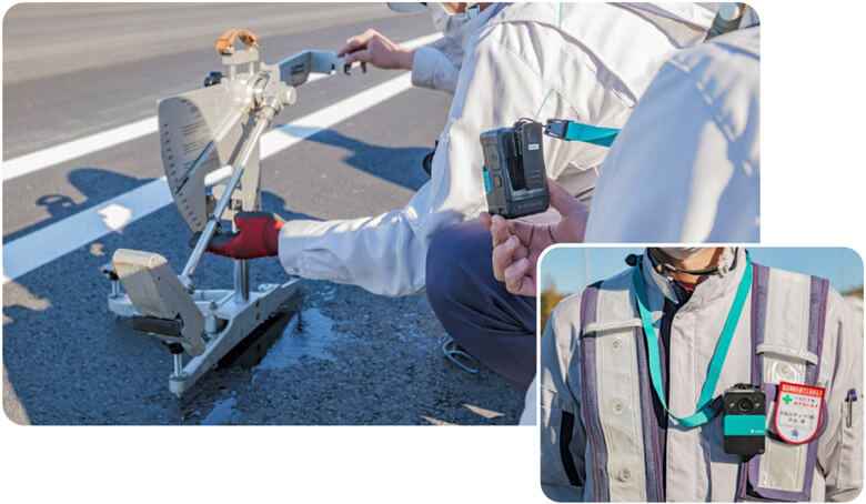 現場作業者が試験の様子をSafie Pocket2で撮影し、遠隔にいるNEXCO東日本担当者に共有している。高画質カメラと通信機能を内蔵しつつ、小型でかさばらない点がSafie Pocket2の特徴だ