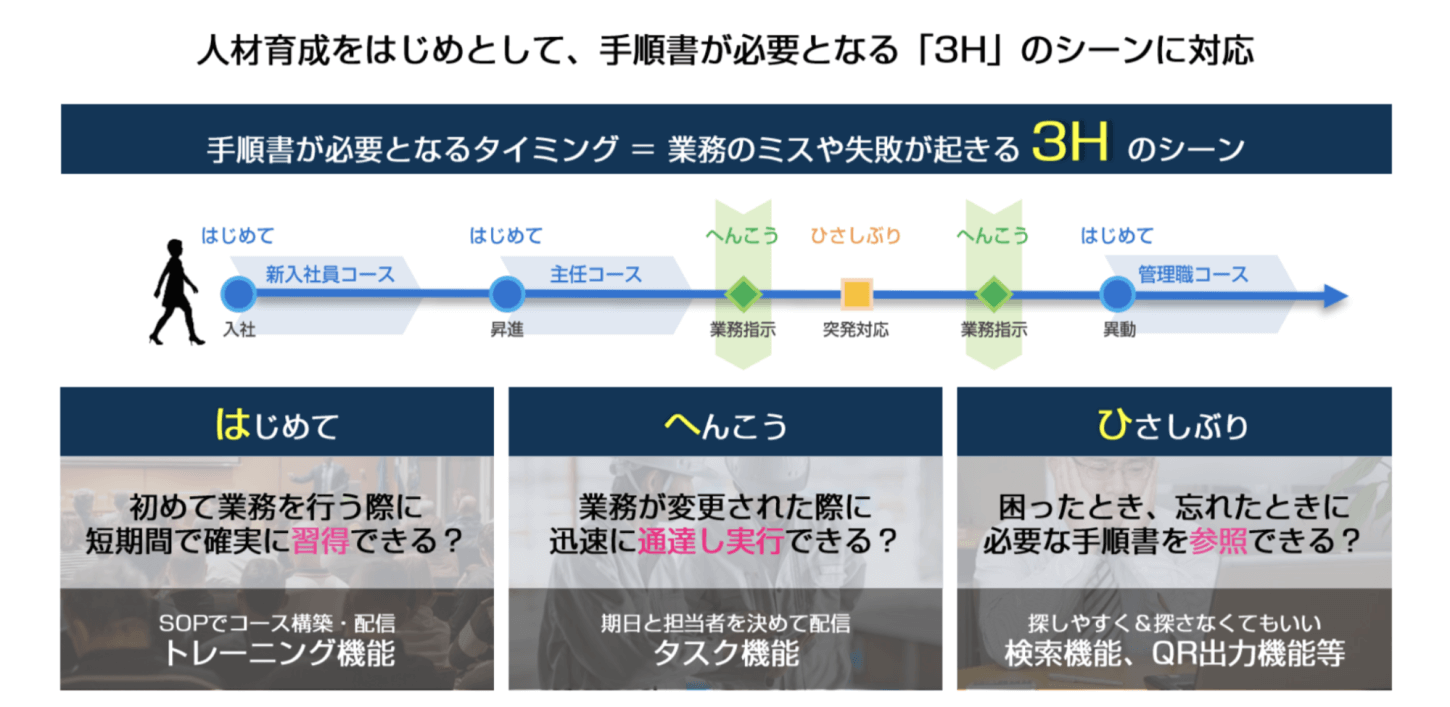 製造業などでは業務のミスが起きやすいシーンである「はじめて・へんこう・ひさしぶり」の頭文字を取って3Hという考え方が普及しています。この3Hのタイミングでマニュアルを使えることが必要です。