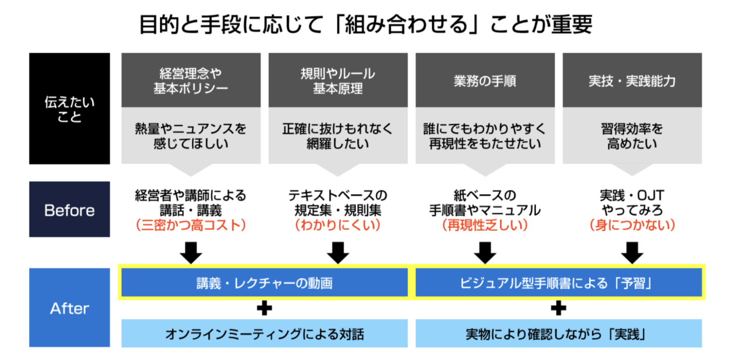 また、共有する段階では、伝えたい内容や目的に合わせて適切な手段を選択し、組み合わせることにも気をつけましょう。特に昨今のようにリモートワークを併用する環境では、リモートで教える部分もありながら、直接対話をしながら教える部分もうまく組み合わせていく必要があります。