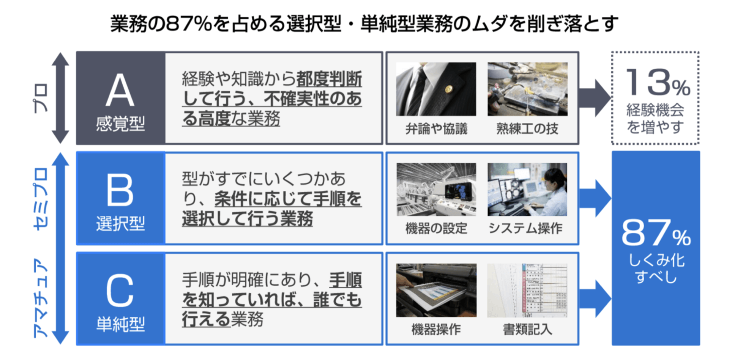 ただし、マニュアルは決して万能ではありません。業務には、性質によって仕組み化すべきものとそうでないものがあります。弁護士や熟練工のように「A:感覚型」の業務を身に着けるには経験機会を増やすしかありません。