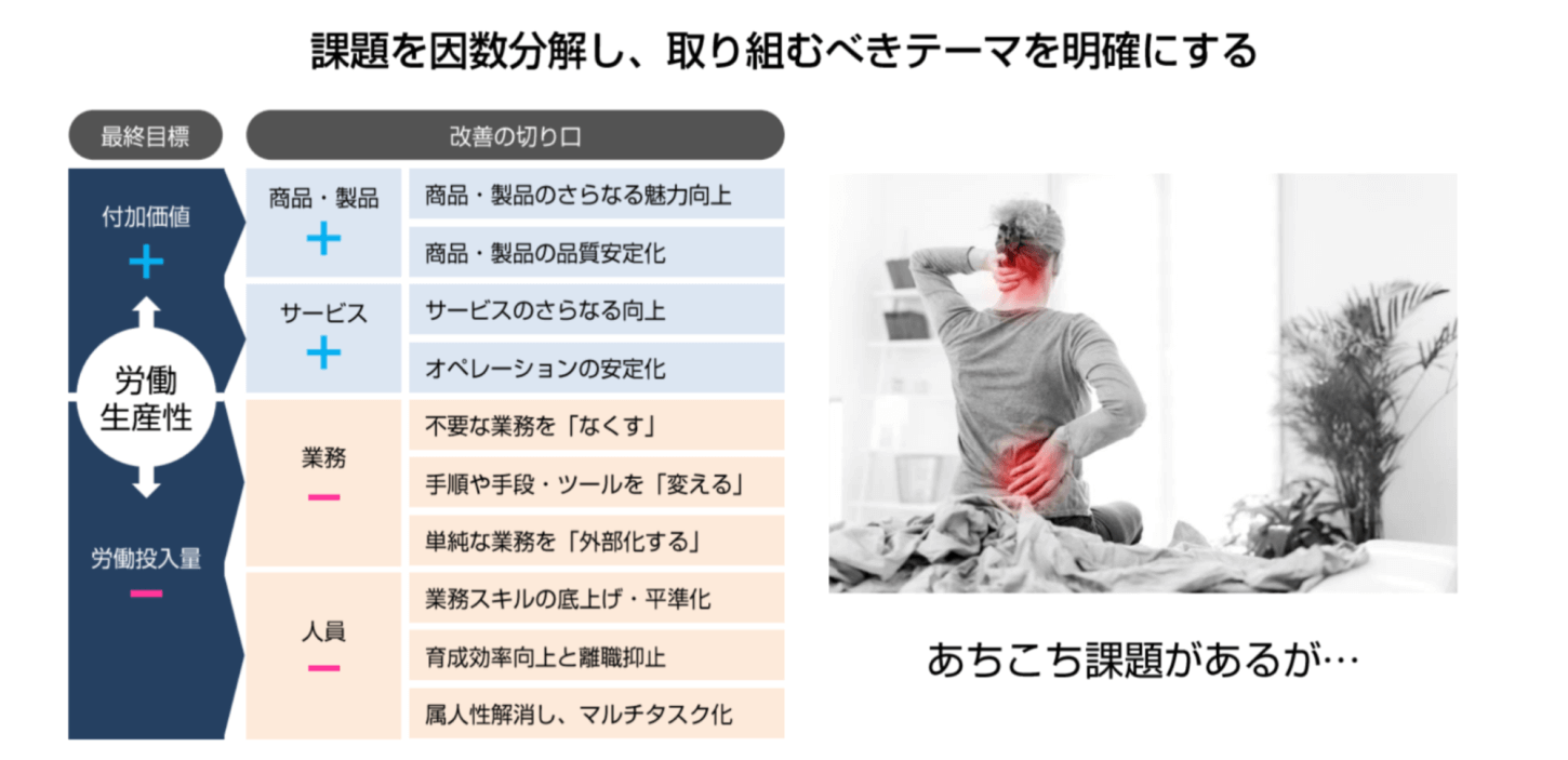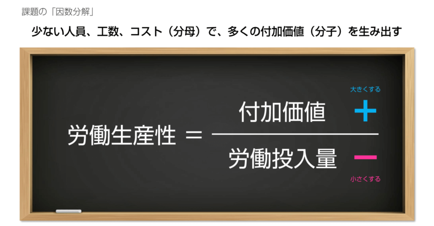 具体的にいうと、減らすべき労働の投入量とは、業務のボリュームや人員リソースの投入量。そして、増やすべき付加価値とは、商品や製品の魅力向上や、人が提供するサービスの価値向上などです。