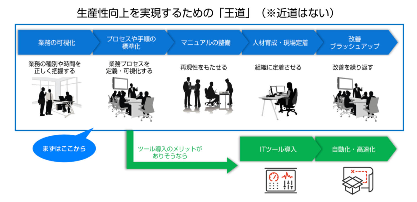 その王道とは、まず業務そのものを可視化し、手順を定めて標準化し、マニュアルを作り、現場に定着させた上で、さらに現場の改善を繰り返すというプロセスです。以下の図のように、IT化や自動化を行う上でも、それらのプロセスを経ていることが前提となります。