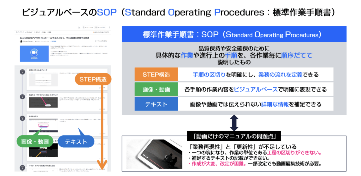 「Teachme Biz」というサービスは、ビジュアルベースで標準の作業手順書(SOP)を作り、かつ共有できるソリューションです。