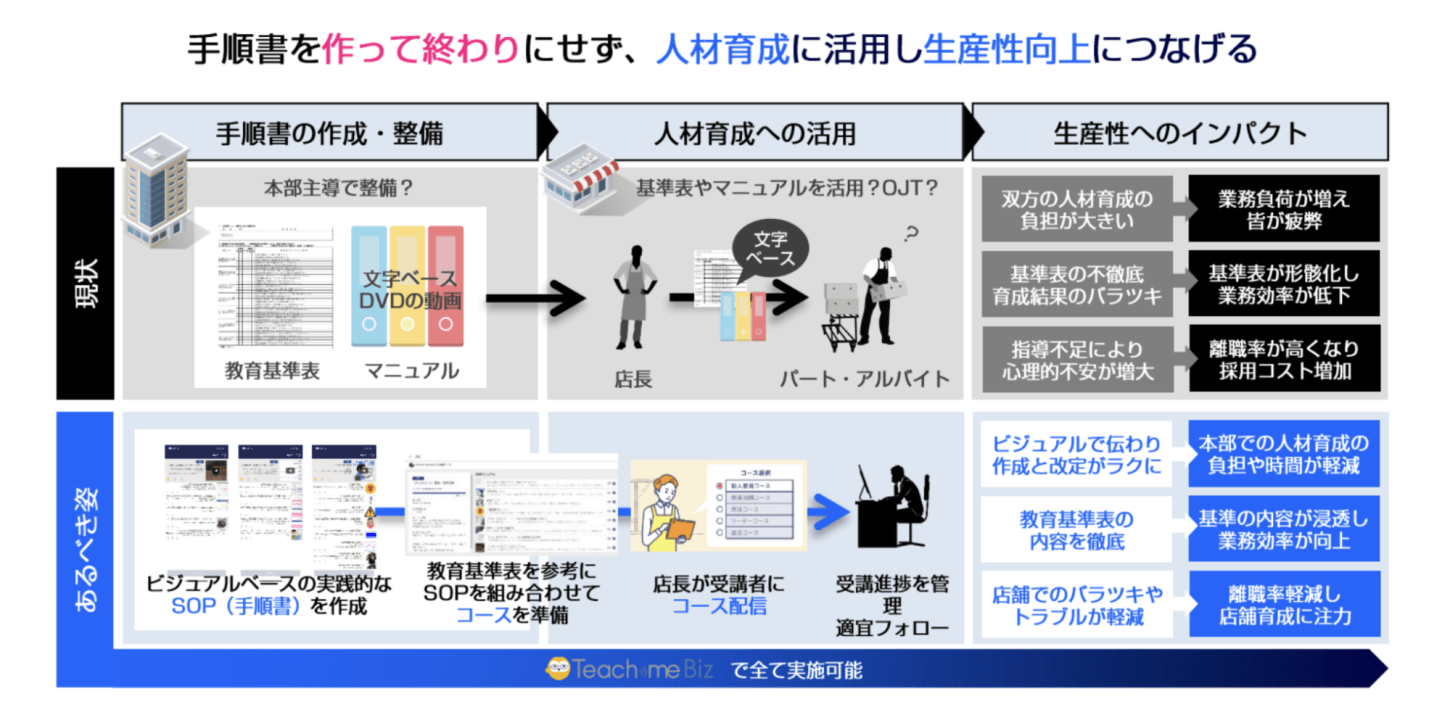 可視化の部分ではSafieカメラを設置することでわかるところも多いです。では、可視化することで得られた知見をどうやって標準化し、定着させていくのか。この部分でマニュアル作成・共有システム「Teachme Biz(ティーチミー・ビズ)」が活躍します。