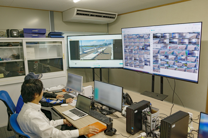 河島さん:万博アクセスルートの警備や監視を受注した委託業者にて、専用の監視ルームにSafieのライブ映像を映し出し、常時モニタリングしております。これは、走行の安全管理を目的として、車両の逆走や誤進入、禁止区域における停車車両の有無、ゲートのバーや壁との接触などの状況を確認しています。