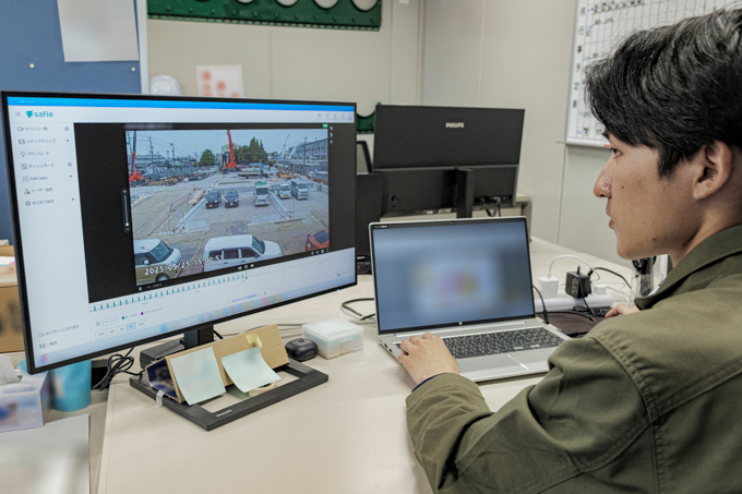 伊藤さん:私たち担当スタッフは現場付設の事務所のデスクにデュアルモニターを設置してカメラとつなぎ、折に触れて安全対策や進捗状況を確認しています。また、盗難などが発生した際は過去映像を見返して経緯の事実確認を行います。