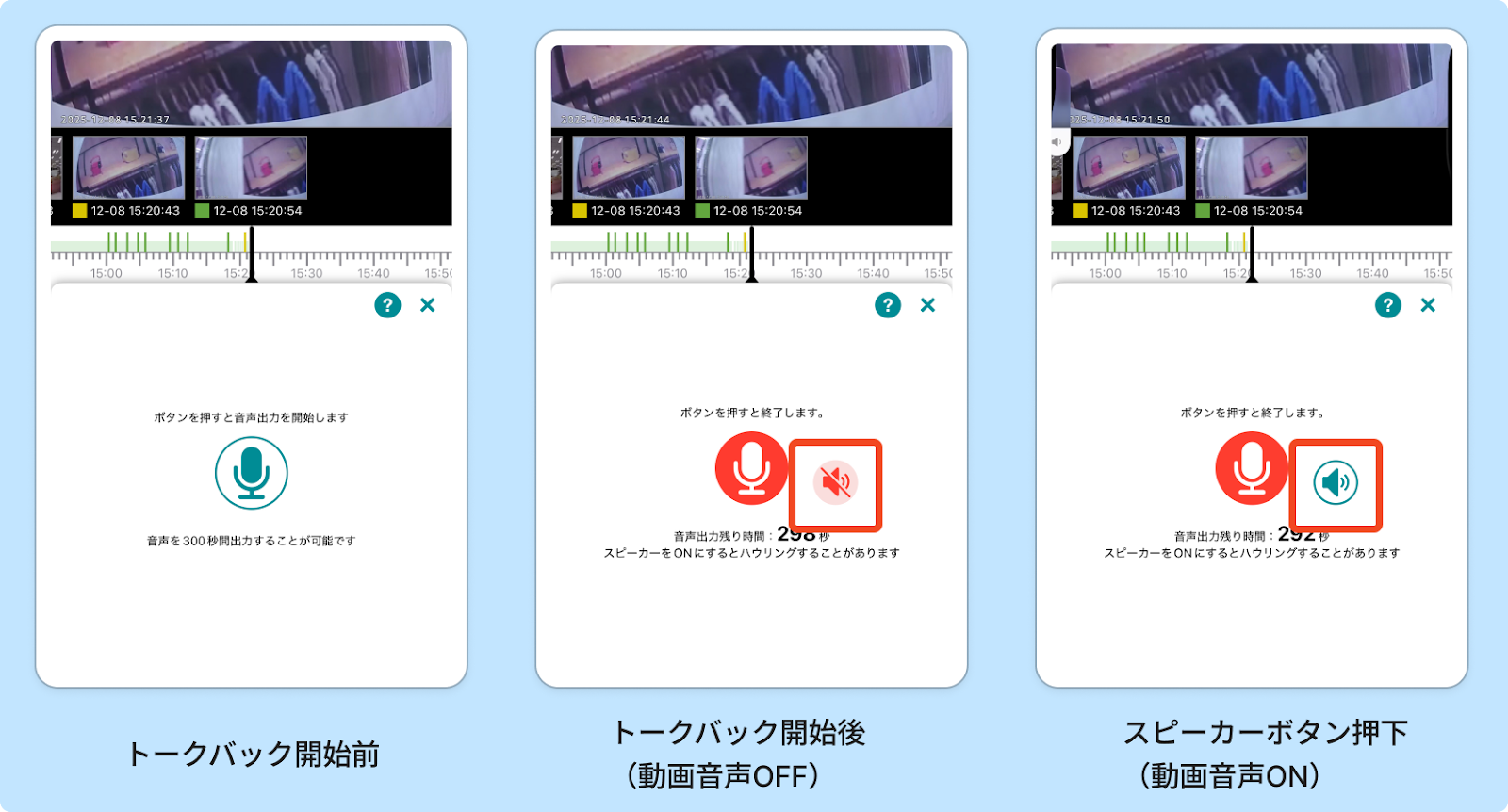 周囲の環境音が大きいカメラに対してトークバックを実行した際、再生中の動画音声が再びスマホのマイクに拾われることでハウリングが起こることがあります。それを避けるため、トークバック時の動画音声はデフォルトで OFF(ミュート)とし、トークバックをしながらも現場の音声を聞きたい場合には、それを ON にできるスピーカーボタンを追加しました。