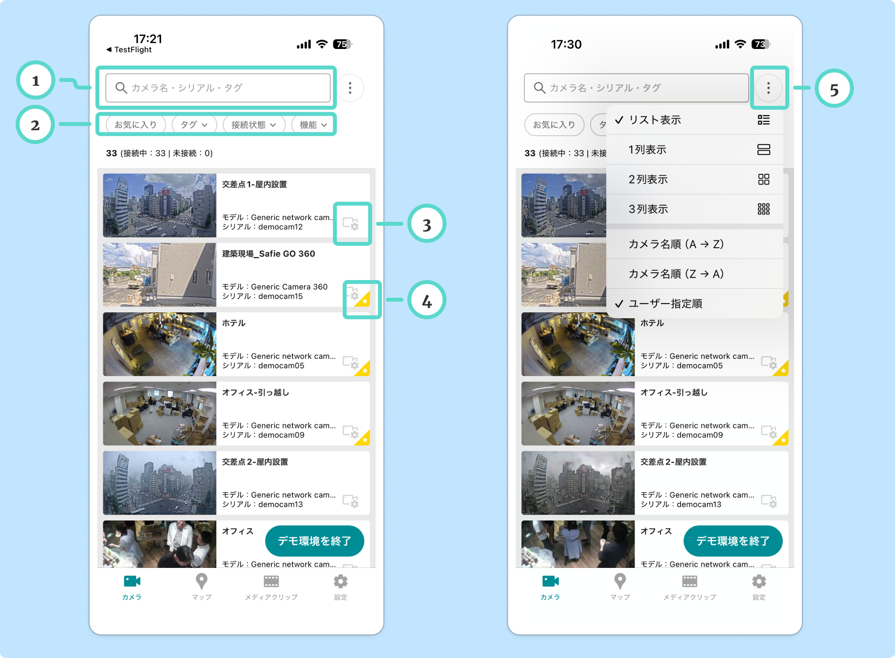 - ⑤...右上の三点メニューから、カメラ一覧の表示方法や並び順を変更できます